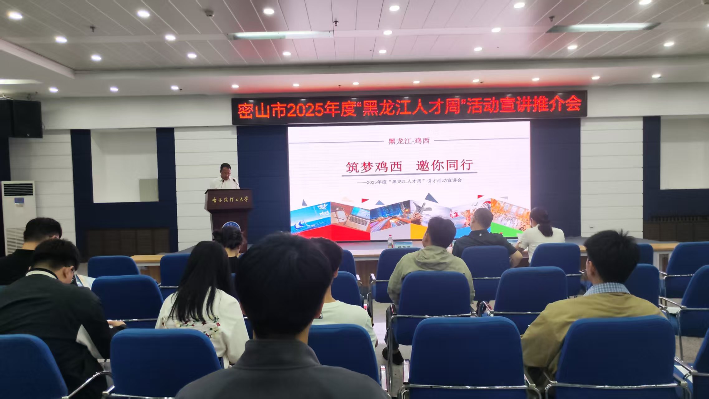 任海峰表示,密山是安居乐业、放飞梦想、挥洒青春的理想之地。密山始终秉承“人尽其才、才尽其用”理念,落实“导师团”培养制度,打造“12+N”人才活动品牌,为人才成长铺路搭桥;在工资待遇、人才补贴、住房补助等方面持续加码,用实打实的政策红利解决人才后顾之忧,比以往任何时候都更加渴盼人才、更能承载人才、更会成就人才。现场,任海峰副部长全面推介此次“黑龙江人才周”鸡西市岗位计划,他向同学们发出诚挚邀约:“真诚期盼大家了解密山、结缘密山、选择密山、筑梦密山、建功密山”。