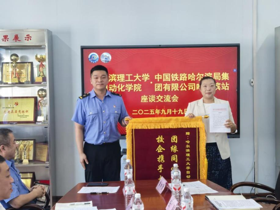 仪式上,哈尔滨站团委向学院团委赠送锦旗及感谢函,高度肯定自动化学院青年志愿者在春运、暑运及重大活动中的志愿服务工作。胡军院长与李岩书记互赠纪念品,进一步深化了双方的友谊与合作关系。