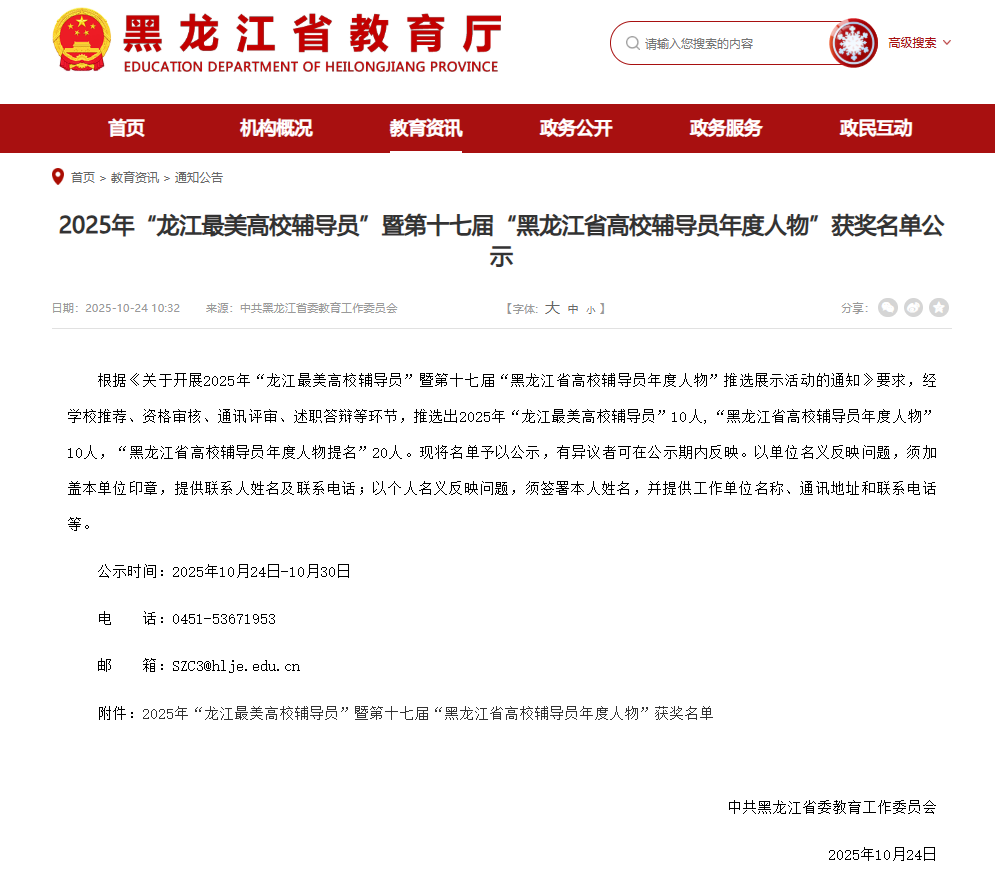 近日,黑龙江省教育厅举办2025年“龙江最美高校辅导员”暨第十七届“黑龙江省高校辅导员年度人物”推选展示活动,本次评选经学校推荐、资格审核、通讯评审、述职答辩等环节,推选出2025年“龙江最美高校辅导员”10人,“黑龙江省高校辅导员年度人物”10人,“黑龙江省高校辅导员年度人物提名”20人。我校经济与管理学院辅导员臧晓明荣获2025年“龙江最美高校辅导员”荣誉称号。