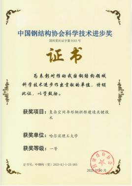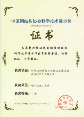 我院团队与龙建科工、龙建路桥股份、中铁山桥集团、中国地震局工程力学研究所等央国企单位联合研发的成果《耐低温钢结构桥梁低温建造关键技术研究及工程应用》获得“中国钢结构协会科学技术进步二等奖”。此项研究成果针对钢桥梁建设中面临的桥梁用耐低温结构钢成本和性能匹配度低、耐低温钢材在低温环境下焊接质量难以保障以及钢桥板单元U肋焊接熔透率技术瓶颈三大核心难题,针对钢桥梁冬季极寒天气服役要求及低温环境焊接施工需求,开展了耐低温钢桥梁专项技术研究,系统性地突破了低温环境下耐低温钢桥梁材料、设计与制造的关键技术瓶颈,实现了从基础理论、核心材料、制造工艺到工程应用的系统性创新,项目部分成果达到国际领先水平。该成果由王圣保老师领衔指导、校企合作产业导师联合指导,学生裴江宁等人共同参与并取得证书,是我院重要的产学研教联合攻关的科研成果之一。该研究产生专利32项、论文16篇、软件著作权12篇、工法5项、标准5项。