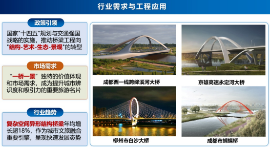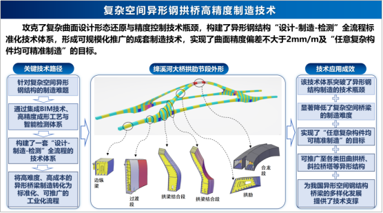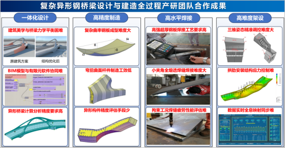 我国桥梁工程正经历从功能型基础设施向“结构-艺术-生态-景观”多维融合转型升级,复杂空间异形结构桥梁建设需求旺盛。我院科研团队与中铁山桥集团、中建西南院、中国水利水电七局、西南交通大学等单位开展联合研发的成果《复杂空间异形钢拱桥建造关键技术》获得“中国钢结构协会科学技术进步一等奖”。该成果依托成都绛溪河大桥、北京京雄大桥、柳州白沙大桥等城市地标性桥梁工程,开展了复杂异形钢拱桥高效建模参数化协同设计、异形钢板冷弯成形、小夹角全熔透焊接、复杂异形钢曲面构件高精度制造与装配建造等多项技术攻关,取得了重大技术突破。自主研发高强特厚钢自适应冷弯成形技术,解决空间扭曲构件的精准制作难题,并在行业首次攻克22度小夹角全熔透焊缝在强拘束条件下的焊接难题,填补30度以下小夹角焊接技术国内外空白,项目成果达到国际领先水平。研究成果获授权专利37件、软著12项、工法5项、标准3部、发表论文26篇。