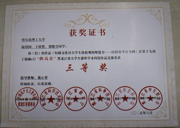 第十九届工银融e行“挑战杯”黑龙江省大学生课外学术科技作品竞赛近日落下帷幕,我院研究生团队凭借《短剧文化对大学生价值观的塑造力——以抖音平台为例》研究成果,荣获省级三等奖,充分展现了我院学子的科研素养与创新活力。