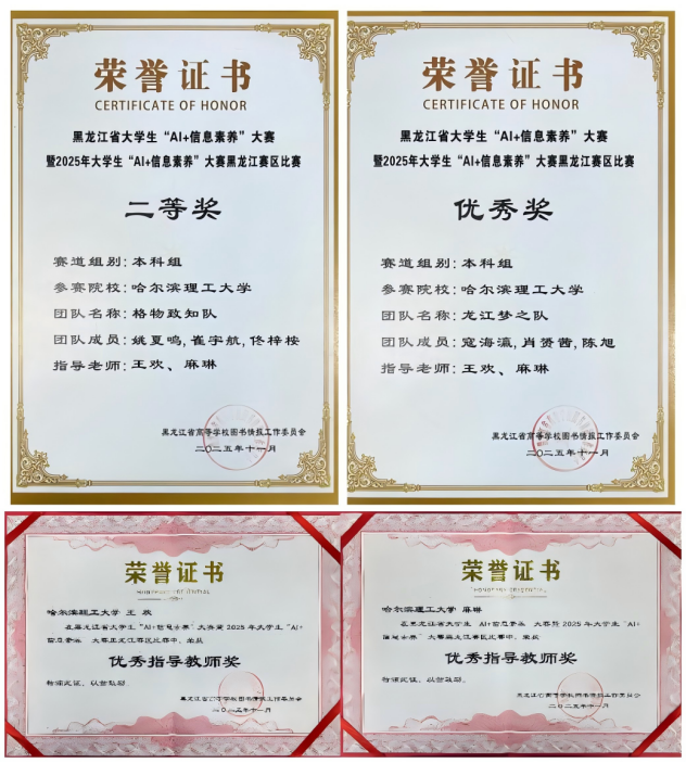 在近日落幕的2025年全国大学生“AI+信息素养”大赛黑龙江赛区中,我校两支队伍表现优异:建筑工程学院姚夏鸣、自动化学院崔宇航、电气与电子工程学院佟梓桉同学组成的“格物致知队”获本科组二等奖;经济与管理学院寇海瀛、陈旭,材料科学与化学工程学院肖赟茜同学组成的“龙江梦之队”获本科组优秀奖。同时,图书馆王欢、麻琳两位老师获“优秀指导教师奖”。本次大赛由教育部高等学校图书情报工作指导委员会等单位指导,全国22个省级高校图工委联合协办,赛期历时四个月。