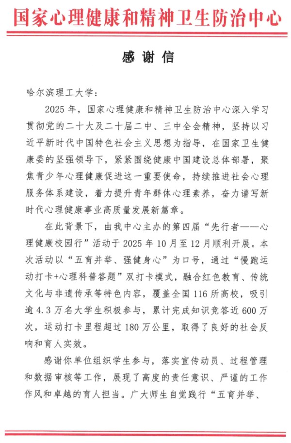 近日,我校收到国家心理健康和精神卫生防治中心发来的感谢信,信中对我校在第四届“先行者心理健康校园行”活动中的卓越表现给予高度赞誉,这是国家主管部门对我校心理健康教育工作的充分肯定,更是全体师生共同努力的丰硕成果!