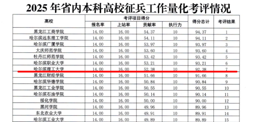 近日,黑龙江省人民政府征兵办公室、黑龙江省教育厅联合开展的2025年度省内本科高校征兵工作量化考评结果正式公布。我校凭借扎实高效的征兵工作举措、特色鲜明的创新实践与优异的综合工作成效,在全省众多参评高校中脱颖而出,荣获2025年省内本科高校征兵工作量化考评第7名(69所高校),省内本(专)科高校表扬人员1名,充分彰显了学校在国防教育与征兵工作中的扎实基础与突出实力。