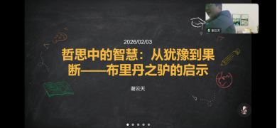 第二场讲座面向七年级初中生,主题为《哲思中的智慧:从犹豫到果断——布里丹之驴的启示》。谢云天老师以14世纪法国哲学家布里丹的著名悖论“布里丹之驴”引入:一头完全理性的驴子站在两堆草中间,因无法理性决断哪一堆更好,最终因犹豫而饿死。这一思想实验叩问自由意志与选择的本质。谢老师通过生动案例——学习中面对多个兴趣社团的纠结、升学时在热门专业与热爱方向间的权衡、生活中遇到两难选择时的彷徨——引导学生剖析犹豫的根源:过度追求“完美理性”往往导致行动瘫痪。他进一步指出,真正的智慧在于:在信息对等、价值相当的情境下,果断做出选择,并通过后续行动验证与调整;思政教育中的“果断”,不仅是个人品质的锤炼,更是青少年一代在新时代伟大征程中勇于担当、主动作为的价值追求。讲座以“选择即责任,选择即成长”的总结升华主题,鼓励中学生在哲学思辨中培养坚定的意志与清醒的判断力。