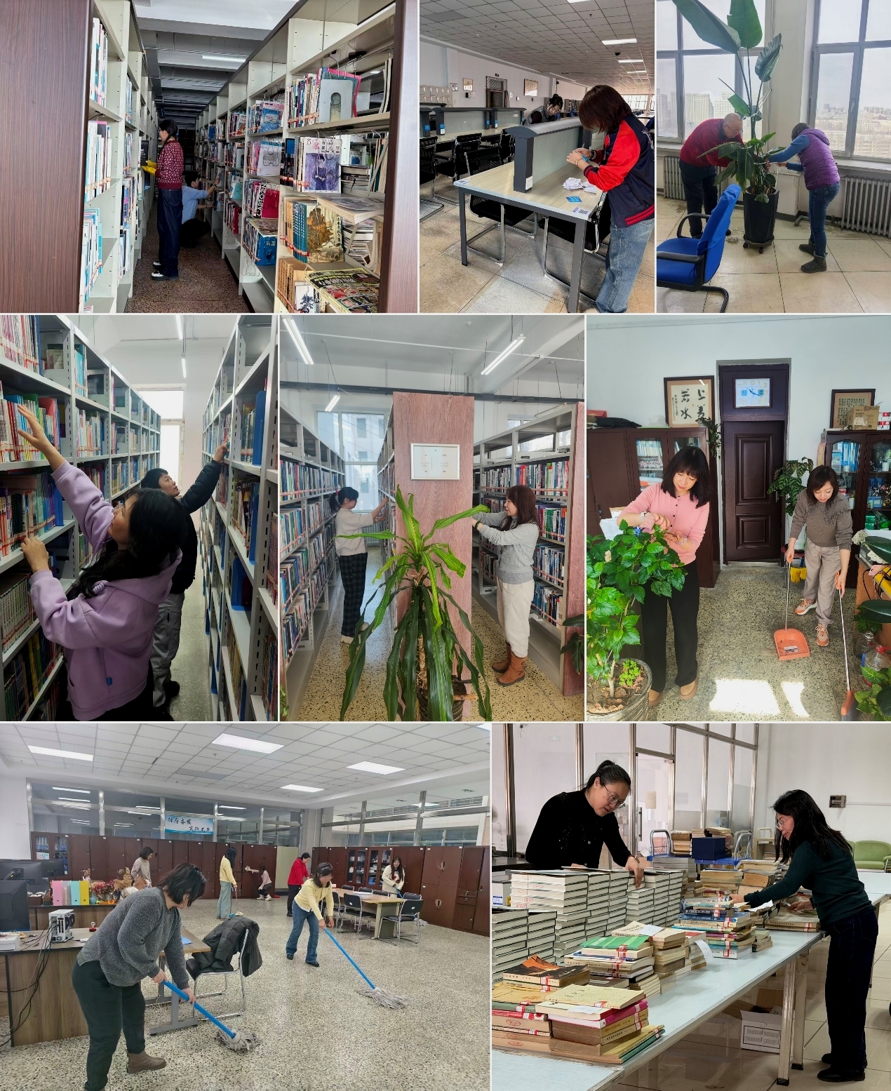 新学期开学第一周,女职工们精神饱满地走上工作岗位,大家一起动手梳理书架、规范摆放各类文献资料、清洁工位环境,擦亮图书馆的各个服务窗口。女职工们干劲十足,热情高涨,精心整理内务,努力给广大师生营造一个整洁有序、书香浓郁的服务环境。