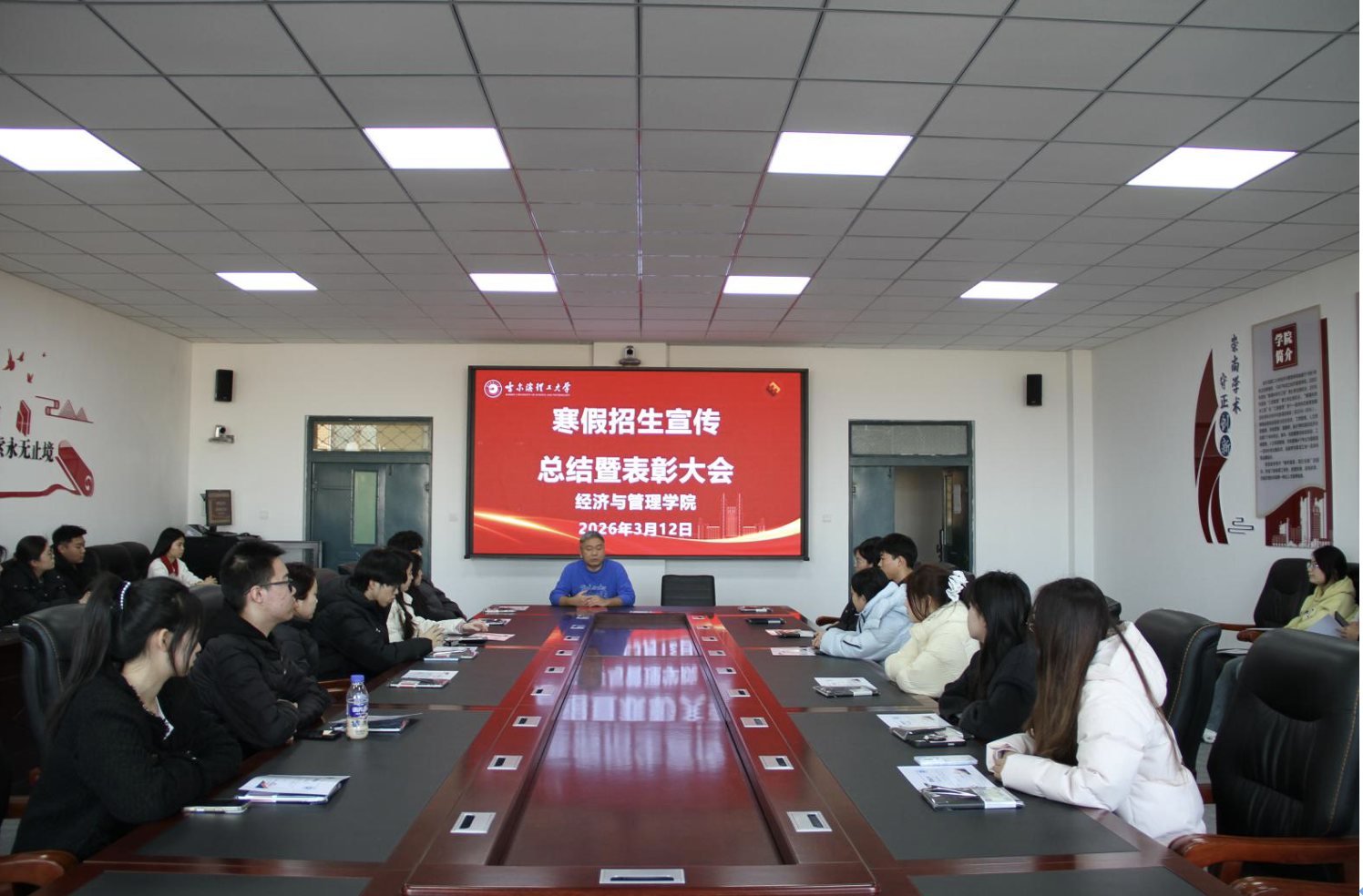为全面总结2026年寒假招生宣传实践工作成效,表彰学院在实践活动中表现突出的优秀志愿者,进一步凝聚宣传力量、传承志愿精神、深化校地交流,做好本年的学院招生宣传工作。3月12日下午,经济与管理学院召开寒假返校招生宣传总结表彰大会。