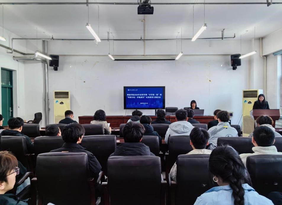 春风浩荡启新程,踔厉奋发向未来。为深入学习贯彻党的二十届四中全会和全国两会精神,全面落实立德树人根本任务,扎实做好新学期育人工作,引导学生以时代精神为引领,迅速收心归位、进入学习状态,3月19日,测通学院在教学主楼E904举行2026年春季学期“开学第一课”主题教育活动。学院党委书记黄春丽、院长吴海滨、党委副书记杨芳,辅导员代表及全体学生干部代表出席本次活动,活动由辅导员李玥桥主持。