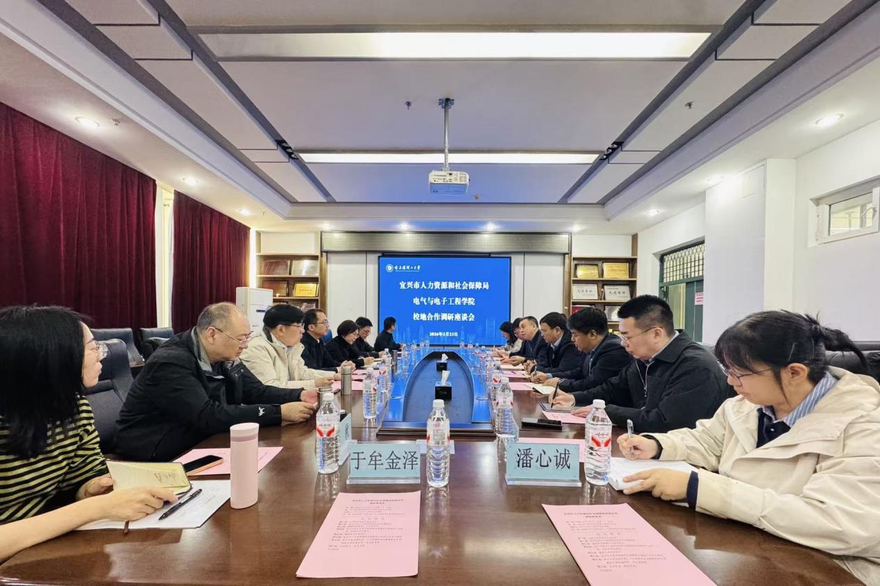为深化校地校企协同合作,推动产学研深度融合,助力人才培养与地方产业发展同频共振,3月23日,电气与电子工程学院在西区教学主楼G1014会议室与宜兴市人力资源和社会保障局开展校地合作调研座谈会。宜兴市人民政府副市长黄烨旻,宜兴市政协副主席、市人力资源和社会保障局局长范燕慧带队,宜兴市人社局、相关镇街道及市委组织部人才工作科相关负责人一行参会。学院党委书记刘骥,副院长高俊国、冯宇,电缆研究所党支部书记郭宁以及学院相关辅导员出席座谈会,座谈会由党委副书记李国辉主持。