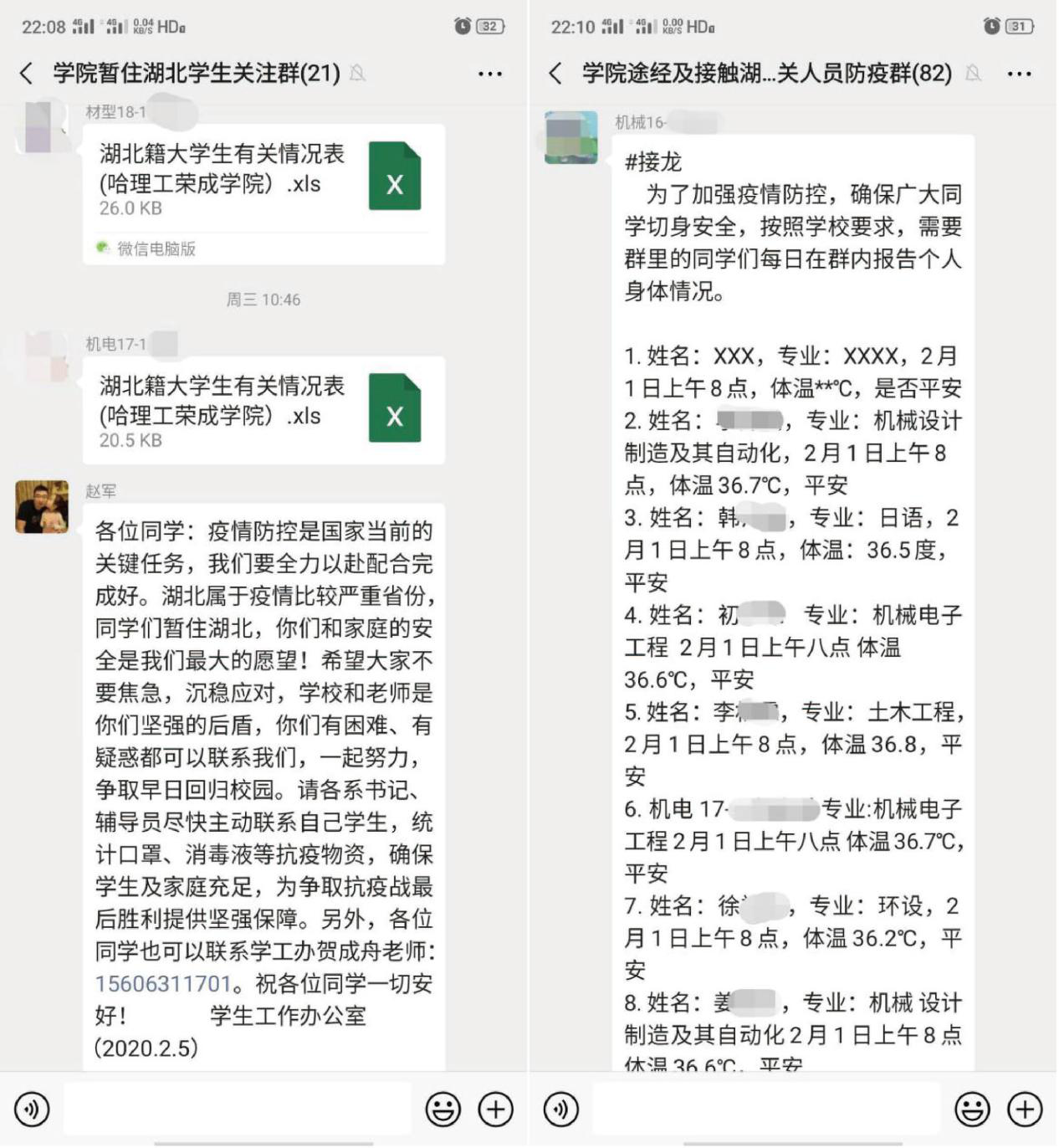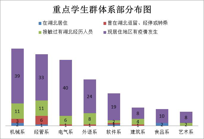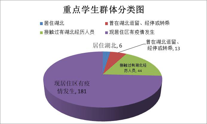 学院将重点人群排查管控工作作为疫情期间重点学生工作。按照学校统一要求部署,学院将重点人群分为三大类,第一类是目前为在湖北居住的学生,第二类是曾在湖北逗留、在湖北经停或者转乘学生,第三类是有过接触过湖北经历人群的学生。随着疫情逐渐深入,学院增加了二类人群作为工作重点,第四类是现居住住所发生疫情的学生,第五类是在居住所确认疫情病情1000例以上的广东、浙江、河南、湖南(湖北以外)4个省份的学生。对以上重点人群身体状态、体温、行动轨迹等情况单独报送,学院指派专门辅导员、学工办负责人点对点联系,建立数据工作台账,及时推送疫情信息,有效做好重点人群排查管控工作,全力以赴安全度过疫情期。