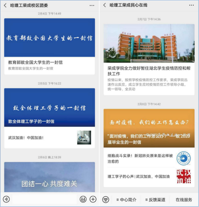 学院转发《教育部致全国大学生一封信》、《哈尔滨理工大学致学生家长们的一封信》等疫情防控工作要求,并且通过微信,QQ群、网站等渠道推送涵盖“新冠”科普、防护措施、校院通知、工作动态以及先进事迹等文章24篇,推送自制抖音短视频2部,制作MV短片《抗击“新冠”》一部,“学习强国”推荐了学院学生文艺原创《入耳入心的防“疫”disco》。教育学生及家长科学理性认识疫情,引导学生服从疫情管控大局,服从学校日程管理安排,倡导合理安排学业规划,鼓励爱心捐赠、志愿服务等防控疫情工作,550余名学生主动通过武汉慈善总会、龙江天使医疗救助基金会、韩红爱心慈善基金会等捐赠渠道,截至2月6日累计捐款6.6万余万元,捐赠口罩近1000个。许多学生参加居民社区,村庄当地防疫的志愿服务队伍中,助力各地疫情防控工作。