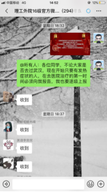 “层层把关,及时准确”。自从发布新型冠状病毒疫情,组织好各班班级负责人联系班级同学及时反映同学的状况,对于未能及时回复信息同学点对点的进行沟通,并且成立研究生疫情防控工作组长群,每天早上9时准时汇报信息,及时有效的了解同学们的情况,充分发挥第一党支部党员职能,每天汇报更新情况。防疫组长,党支部支委,总负责人,辅导员层层把关,层层落实,做到防疫工作事无巨细,面面俱到。