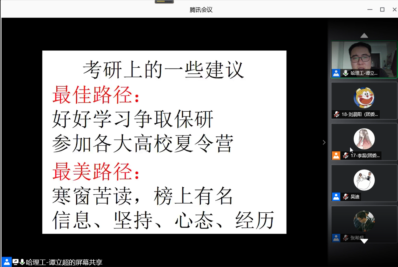 首先谭老师结合自己的教学经历,为同学们分享了关于考研学习指导,就如何准备考研,如何考研等方面的指导建议,心态的调整及对院校的选择,同时也对出国学习深造提了自己的见解;吴迪学长讲述了本科及研究生学习工作中的收获。提到了他支教时的种种经历,也为同学们讲解了在本科学习过程中工作中的态度和方法;高颖同学讲述了在学生干部工作中学习与工作的统筹关系,并讲述了平常的生活经历以及他对考研的了解。