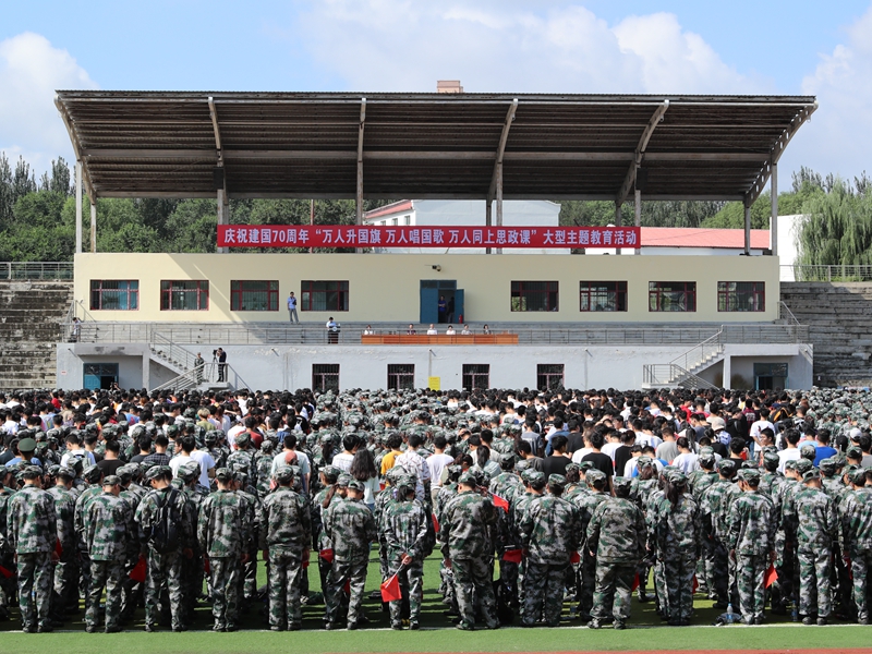 为贯彻落实中共中央办公厅、国务院办公厅《关于深化新时代学校思想政治理论课改革创新的若干意见》,以及省委教育工委、省教育厅《关于在全省高校深入开展大学生“青春告白祖国”主题教育的通知》要求,9月8日上午,哈尔滨理工大学万名师生挥舞国旗,齐聚南区体育场,整齐的学生方阵中央排成“70”字样,共同举办庆祝中华人民共和国成立70周年“万人升国旗、万人唱国歌、万人同上思政课”大型主题教育。校党委书记张洪涛,党委副书记陆岩、王志浩,学工部部长杨忠学,马克思主义学院领导班子以及全体思政课教师出席活动。本次主题教育由马克思主义学院主办,院党委书记李燕军主持活动。中国教育电视台、中国新闻网、央广网、黑龙江电视台、哈尔滨电视台等媒体对此次活动进行全程报道。