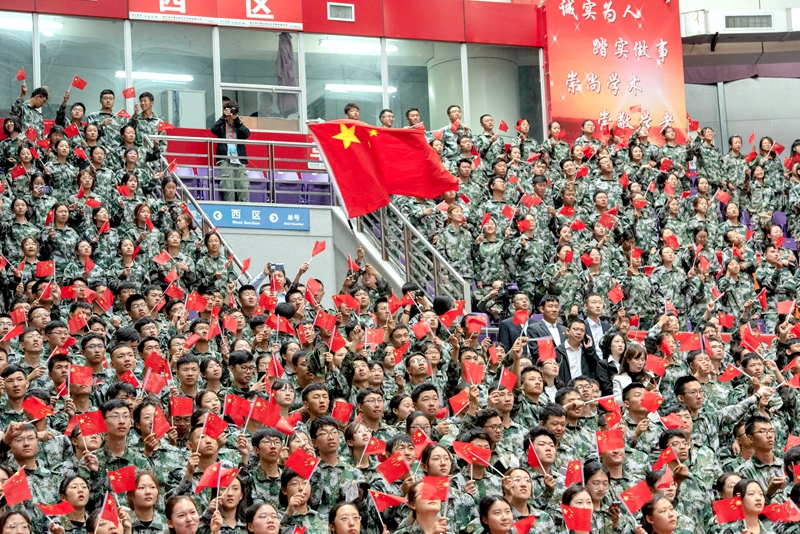 典礼开始前,2019级新生进行了“青春告白祖国”拉歌活动。5000余名新生全体起立,挥舞手中的国旗,“五星红旗迎风飘扬,胜利歌声多么响亮”“我和我的祖国,一刻也不能分割”的歌声嘹亮激昂,向伟大祖国深情告白。