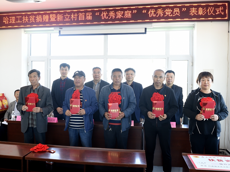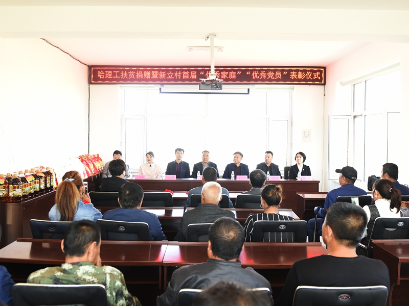 9月25日上午,哈理工产业扶贫电商项目捐赠仪式及新立村2019年度“优秀家庭”、“优秀党员”表彰系列活动在巴彦县丰乐乡新立村举行。校党委书记张洪涛、党委副书记王志浩,巴彦县党委组织部副部长许汉波,丰乐乡党委副书记贾彦莉、副乡长古力,我校统战部部长孙明哲、组织部副部长王莉娟、扶贫工作队队长兼驻村第一书记董少伟及扶贫工作队成员刘猛和张宏磊出席活动,新立村2019年度“优秀家庭”和“优秀党员”代表参加活动。活动由董少伟主持。