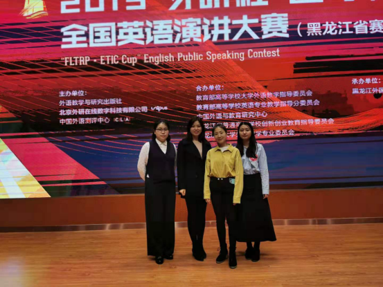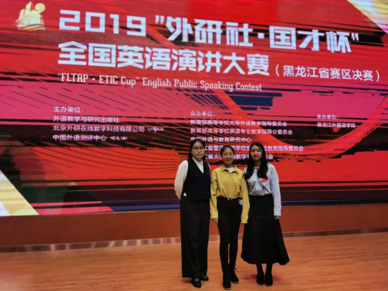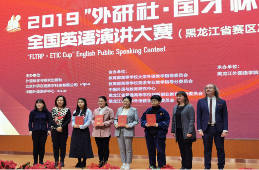 2019“外研社杯”全国英语演讲比赛黑龙江省决赛于2019年10月26日于黑龙江外国语学院隆重举行。我校选手英语17-3严雨晴同学、英语16-3邵蓝仪同学和英语18级研究生吕海宁同学在比赛中发挥出色,分别获得一等奖(第一名)、二等奖和三等奖的优异成绩。大会开始之际,黑龙江省大学外语教学专业委员会会长,我校国际合作与交流处处长姜毓锋教授致辞。外国语学院杨鑫老师指导并带队参加本次大赛。此次比赛得到教务处及外国语学院领导的高度重视和大力支持。