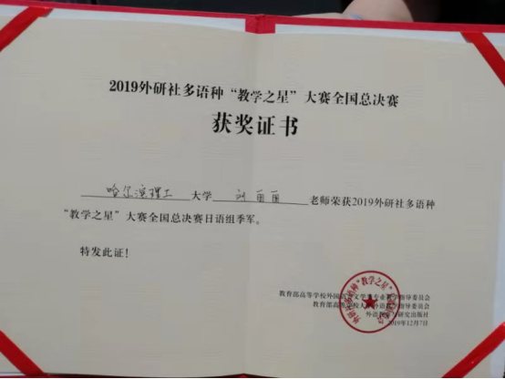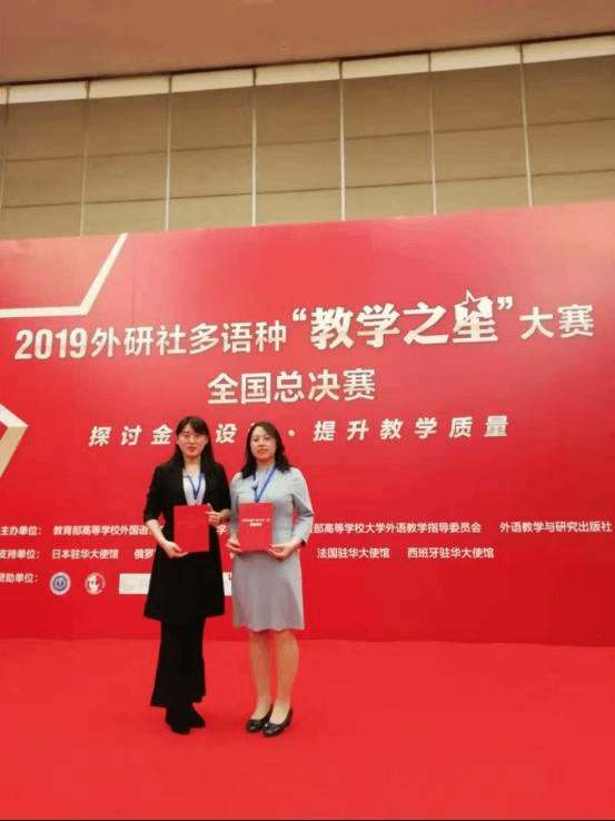 2019年外研社多语种“教学之星”大赛自启动以来,共有来自全国200所院校300余名教师成功进入全国复赛,全国复赛以“录制真实课堂视频”的形式进行评选。组委会经过双向匿名评审,最终选拔出7个语种9个组别共112名参赛教师晋级全国总决赛。其中日语专业组共18名选手、俄语专业组共12名选手晋级总决赛。全国总决赛的冠亚季军争战强势拉开,北京外国语大学、广东外语外贸大学、四川外国语大学、天津外国语大学、大连外国语大学等外语强校都派出了强大的选手阵容参赛。刘丽丽老师和田欣欣老师在学院领导精心指导下,将外语国标精神和课程思政巧妙地融合在课程设计之中,反复推敲教案,精心设计课件,实战演练课堂讲授环节,克服种种困难,凭借扎实的功底,匠心的精神斩获了日语组和俄语组的季军,这是我校外语专业在全国大赛中获得的最好成绩,更是理工科院校日、俄专业教师在全国外语专家面前的一次完美表现。