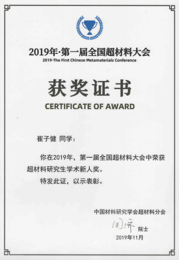 此次大会共设十三个分会场,281个分会邀请报告和290个分会口头报告,170个墙报。700余位专家学者交流探讨了超材料研究和应用、前沿发展最新动态等内容。大会还开设了研究生论坛,有75位研究生获得“超材料学术新人奖”。其中我校理学院研17级电子科学与技术专业崔子健同学在本次会议的研究生论坛中做题为“太赫兹超材料吸收器完美吸收条件及应用”的报告,并通过遴选获得了超材料学术新人奖。