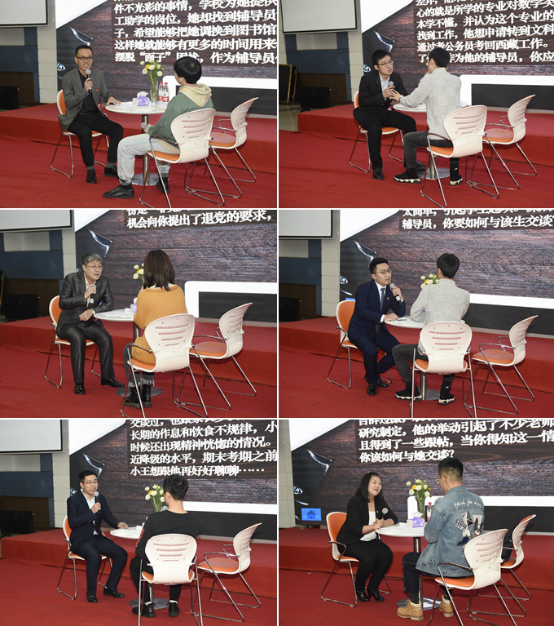 在谈心谈话环节,参赛辅导员们和学生助演分别围绕“学业压力”“宗教信仰”“网瘾少年”“贫困学生”“干部矛盾”“情感困惑”等主题,进行“面对面”的互动交流,引发全场观众共鸣,赢得阵阵掌声。