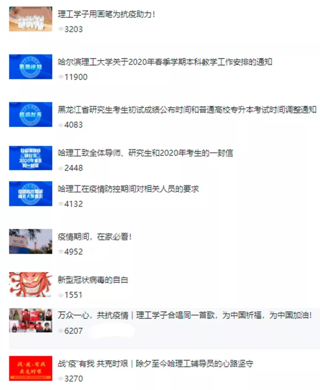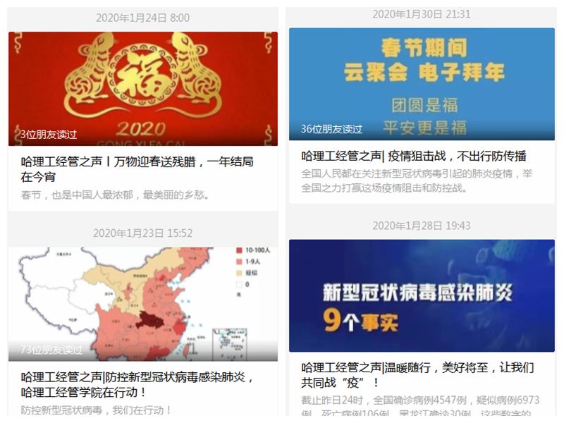为筑起疫情向校园蔓延扩散的严密防线,确保校园师生员工生命安全和身体健康,2月12日起,学校机关干部主动上岗,加强对校园楼宇的入口检查与管理工作,守护校园平安稳定。50余名机关干部积极响应,主动申请投入校园疫情防控工作第一线。当天下午,第一批志愿者在新教学主楼上岗,参与校园封闭管理工作;离退休工作处建立了哈理工离退休工作处防疫工作群,通过哈理工离退休工作处微信公众号和离退休职工微信群,及时转发国家、省市、省教育厅及学校关于新型冠状病毒感染肺炎疫情防控的相关通知;人事处、机关党委与各学院、各教辅部门、各部处密切配合、分条分线,在在职教职工的去向摸排、信息统计等方面做了大量的卓有成效的工作。