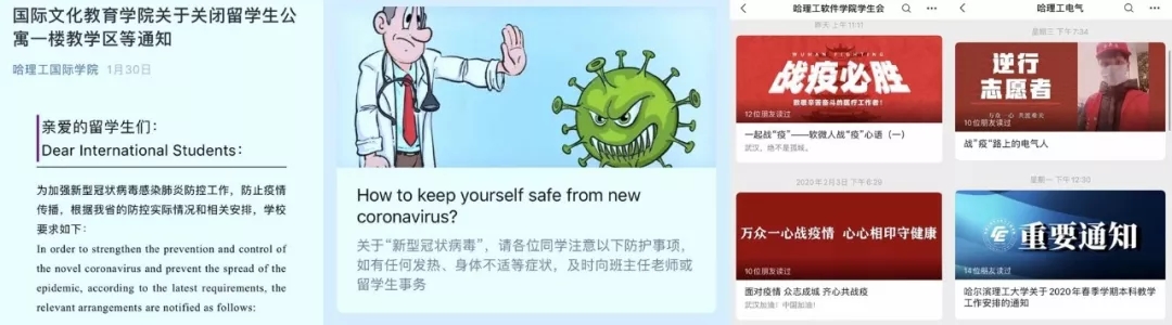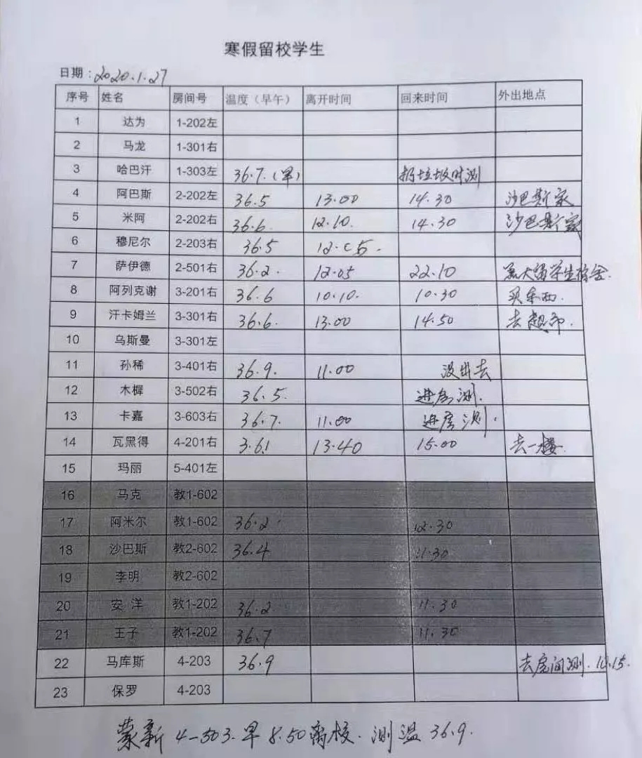 针对留校的留学生:发放口罩,每天消毒,晨、午检测体温并记录,登记学生离校在哈去向。针对离校的外教和留学生:保障沟通畅通,提醒关注学校相关通知。实施疫情管控措施以来,留校留学生服从安排、积极配合,主动在公寓内做好防护措施。从1月24日开始,有关人员每天轮流值班,密切关注学生及学生家长关于疫情方面的信息;按照教育厅和学校的要求,认真筛查了我校33101名本、硕、博学生的情况,为下一步开展工作提供了详实数据。