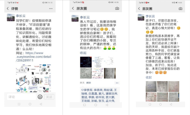 为了激发学生在线学习的动力,从来不发朋友圈的李老师也开始在朋友圈晒笔记,并将专业已毕业学长的回复反馈给学生,激励他们开展目标引领、自我驱动学习。