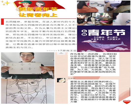为纪念“五四运动”101周年,引导广大青年传承五四精神,深入学习和践行习近平总书记对青年的寄语:“坚定理想信念,站稳人民立场,练就过硬本领,投身强国伟业。”厚植青年爱国情怀,肩负起新时代青春使命,五四期间,我校团委结合疫情防控实际,组织开展了“五四精神、传承有我”线上主题团日活动,各二级学院团组织、我校研究生支教团利用视频云会议、征文、绘画、短视频创作等多种方式,热议时代热点,思考青年责任与担当,展现团员青年同心战疫、勇于担当的青春意志和积极向上、奋发有为的精神面貌,以别出心裁的创意、新颖有趣的形式,传承与践行“五四”精神。