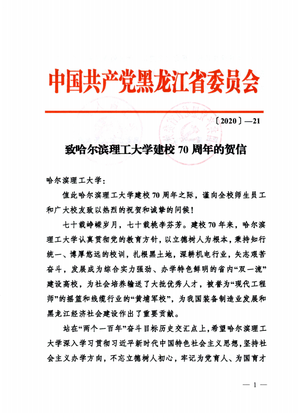 值此哈尔滨理工大学建校70周年之际,谨向全校师生员工和广大校友致以热烈的祝贺和诚挚的问候!