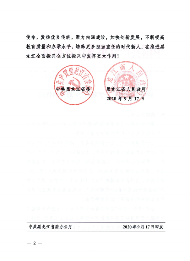 站在“两个一百年”奋斗目标历史交汇点上,希望哈尔滨理工大学深入学习贯彻习近平新时代中国特色社会主义思想,坚持社会主义办学方向,不忘立德树人初心,牢记为党育人、为国育才使命,发扬优良传统,聚力内涵建设,加快创新发展,不断提高教育质量和办学水平,培养更多担当重任的时代新人,在推进黑龙江全面振兴全方位振兴中发挥更大作用!