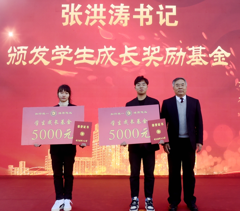 校党委书记张洪涛为“最美逆行者”子女、新生白雨轩和蔡金笑颁发荣誉证书和学生成长基金