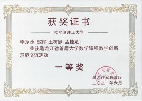 罗来珍(主讲教师)、赵辉、付作娴、杜杨团队主讲《概率论与数理统计》课程获得了教授组一等奖第一名,并获得教学设计创新奖;李莎莎(主讲教师)、赵辉、王树忠、孟桂芝团队主讲《高等数学》课程获得了讲师组一等奖第一名;董刚(主讲教师)、孟桂芝、赵辉团队主讲《高等数学》课程获得了讲师组三等奖。教师罗来珍和李莎莎将代表黑龙江省参加“首届全国高校大学数学课程教学创新示范交流活动”。