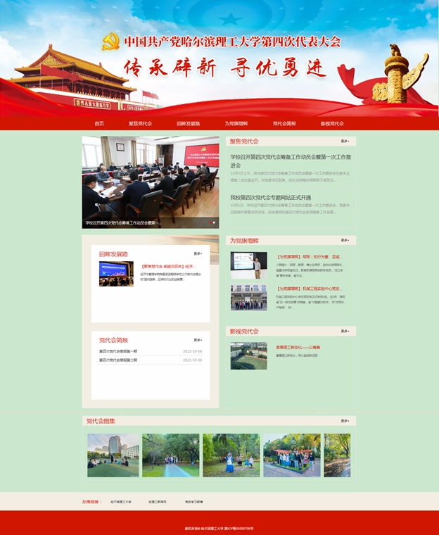 10月5日,学校召开第四次党代会筹备工作动员会暨第一次工作推进会,党委书记赵琳作部署动员讲话,标志着我校第四次党代会各项筹备工作全面开启。为进一步提高认识、统一思想、凝聚人心、振奋精神,营造良好的舆论氛围,根据学校第四次党代会筹备工作的相关要求,确保及时、全面、准确地宣传报道学校第三次党代会以来取得的成就及第四次党代会盛况,中国共产党哈尔滨理工大学第四次代表大会专题网站(下称专题网站)于10月10日正式开通。