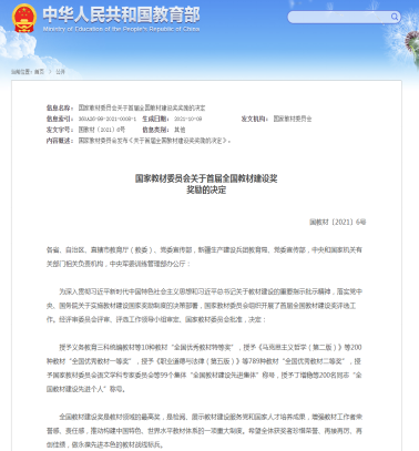 据悉,全国教材建设奖由国家教材委员会主办、教育部承办,每4年评选一次,是国家教材领域的最高奖,是检阅、展示教材建设服务党和国家人才培养成果,增强教材工作者荣誉感、责任感,推动构建中国特色、世界水平教材体系的一项重大制度。旨在深入贯彻落实习近平总书记关于教材建设的重要指示批示精神,展示党的十八大以来我国教材建设取得的重大成就,促进教材建设,提高教材质量。