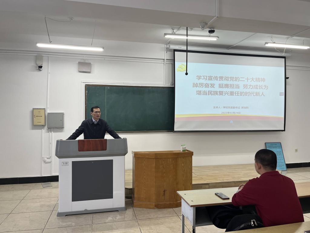 为深入学习宣传贯彻党的二十大精神,落实习近平总书记对青年工作的重要论述,增强青年学生的使命感、责任感,新学期初,学校党委副书记郭加利以“学习宣传贯彻党的二十大精神 踔厉奋发 挺膺担当 努力成长为堪当民族复兴重任的时代新人”为主题,分别于2月28日和3月1日为学校团学骨干和马克思主义学院2022级法学专业学生宣讲党的二十大精神,讲授“开学第一课”。