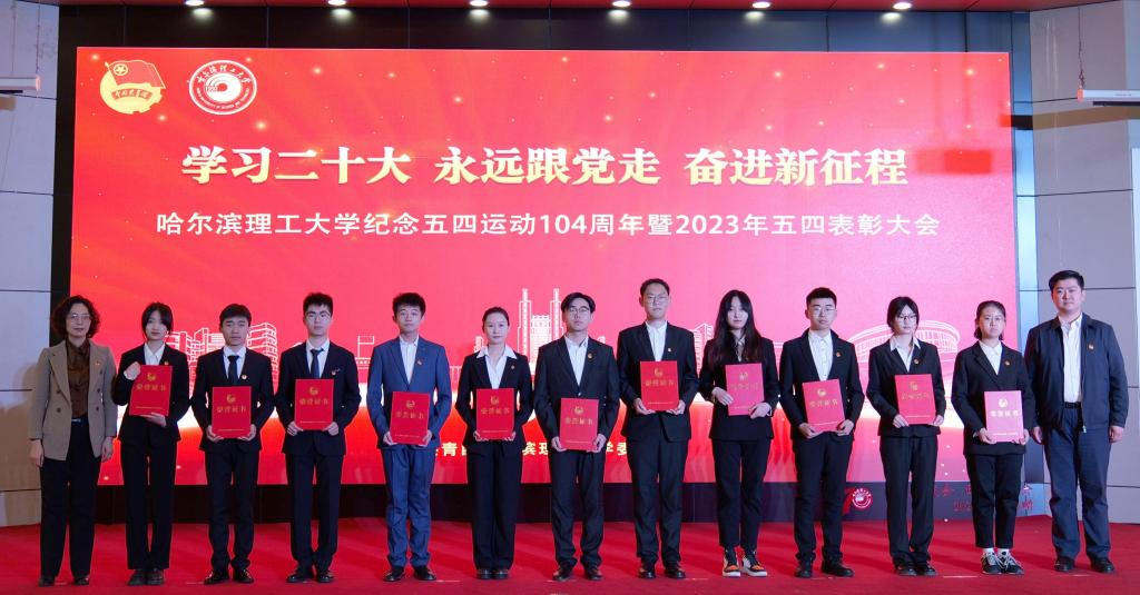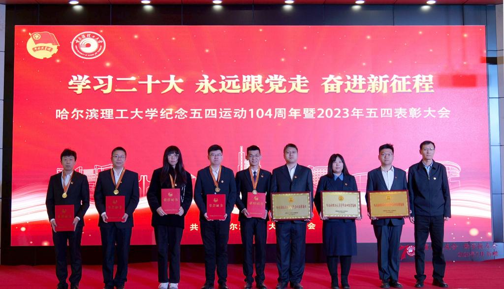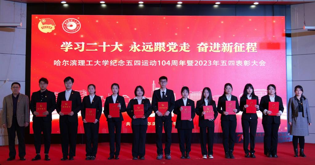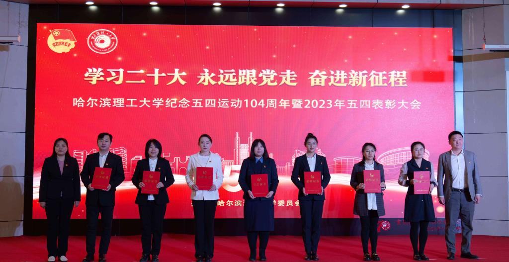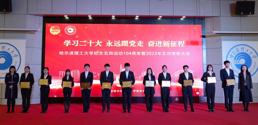 党委学工部部长戴湘竹、团委书记韩彧博为2022年度哈尔滨理工大学五四红旗团支部代表颁奖
