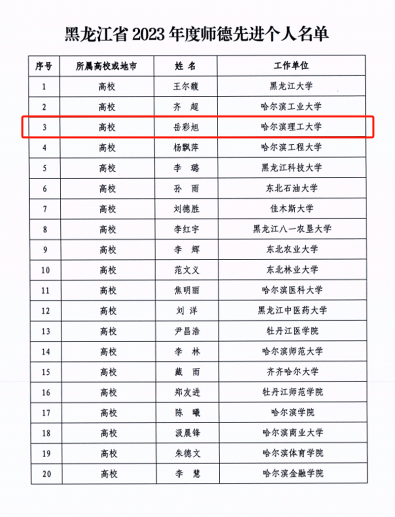 为弘扬尊师重教的社会风尚和广大教师立德树人、无私奉献的精神,省教育厅组织开展了2023年全省师德先进集体和师德先进个人评选活动。本年度共评选出师德先进集体66个、师德先进个人178人。我校材料科学与化学工程学院被授予“2023年度全省师德先进集体”荣誉称号,机械动力工程学院岳彩旭教授被授予“2023年度全省师德先进个人”荣誉称号。