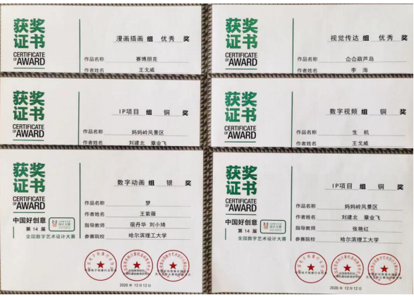 由我校艺术学院教师张艳红指导的作品《妈妈岭风景区》斩获了IP项目组铜奖;由宿丹华、刘小琦老师指导的作品《梦》、《生机》荣获数字动画类银奖及数字视频类铜奖;由郭春苗老师指导的的作品《仚仚葫芦岛》喜获视觉传达组优秀奖;由宿丹华、刘小琦老师指导的作品《赛博朋克》获漫画插画类优秀奖。