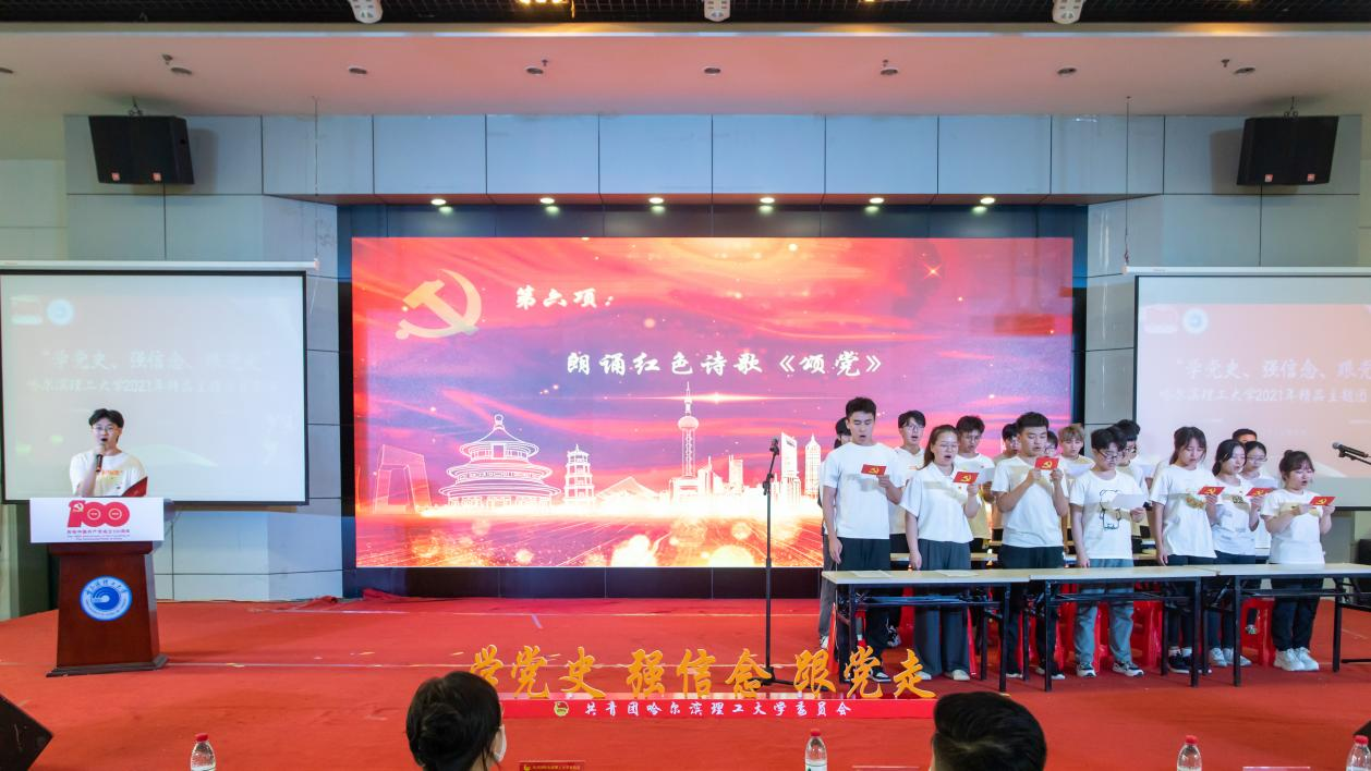 为隆重庆祝中国共产党成立100周年,贯彻习近平总书记在党史学习教育动员大会上的重要讲话精神,落实团中央《共青团中央关于在全团开展“学党史、强信念、跟党走”学习教育的通知》要求,教育引导广大团员青年学史明理、学史增信、学史崇德、学史力行,厚植爱党、爱国、爱社会主义情怀,哈尔滨理工大学2021年“学党史、强信念、跟党走”精品主题团日展演活动于6月19日下午15时在我校一号楼0220报告厅拉开帷幕。校团委副书记曹石、学生工作部副部长兼团委副书记任佳伟、各学院团委书记以及200余位2019级、2020级各班级团支书参加本次活动。