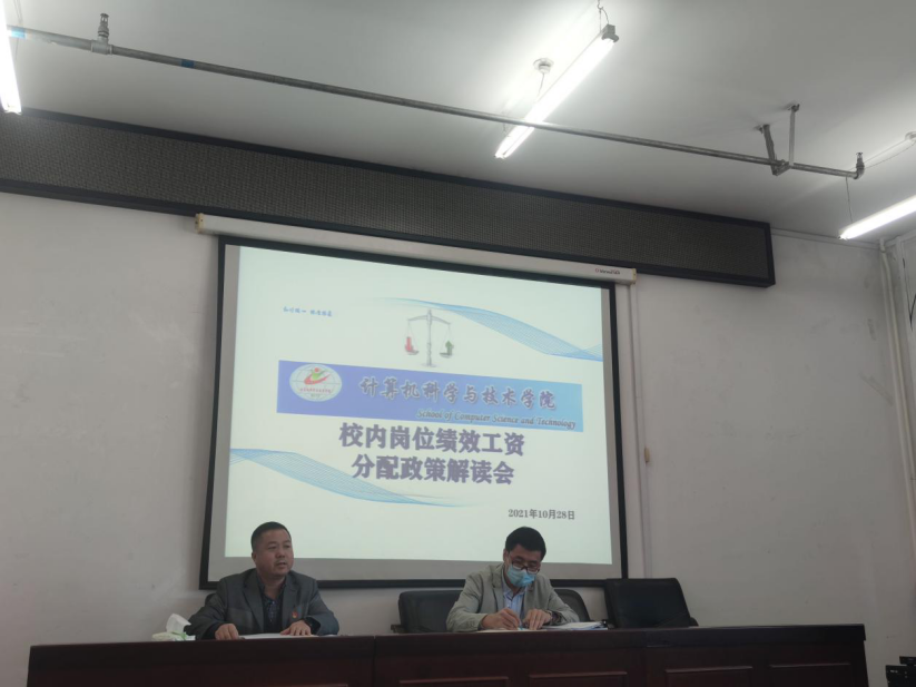 为推进完善与岗位设置和绩效工资制度相适应的分配制度,进一步完善学校收入分配制度,充分发挥二级单位在岗位绩效工资分配中的主体作用,调动广大教职工的积极性、主动性和创造性,学校先后印发了《哈尔滨理工大学校内岗位绩效工资改革实施办法》、《哈尔滨理工大学校内岗位绩效工资分配的指导意见(试行)》(以下称《指导意见》)等政策文件。为了便于广大教师深刻理解政策文件的关键点和岗位绩效工资的分配导向,10月29日上午10点30分,计算机科学与技术学院邀请人事处副处长付立军为学院全体教职工解读学校校内岗位绩效工资政策。会议在新主楼E1523举行,学院院长黄海主持会议,学院班子成员,各系部中心主任、副主任,各党支部书记、副书记参加,为响应疫情防控要求,严格控制参会人员人数,并按要求间隔就坐。
