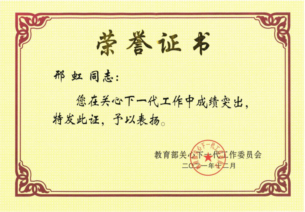 近日,教育部关心下一代工作委员会、黑龙江省关心下一代工作委员会和中共黑龙江省精神文明建设指导委员会办公室分别印发《关于表扬全国教育系统关心下一代工作先进集体、先进工作者和突出贡献者的通报》教关委函【2021】19号,《关于表彰全省关心下一代工作先进集体和先进个人的决定》黑关发【2021】13号,我校邢虹同志荣获“全国教育系统关心下一代工作先进工作者”、陆鸣鹃同志荣获“全省关心下一代工作先进个人”、哈尔滨理工大学机械动力工程学院关工委荣获“全省关心下一代工作先进集体”荣誉称号。