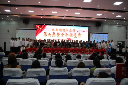 为庆祝中华人民共和国成立70周年,学习贯彻落实习近平新时代中国特色社会主义思想,重温党的辉煌成就,继承和发扬中国共产党的优良作风,激发同学们爱党爱国热情,9月25日,以"辉煌七十年,奋进新时代——热烈庆祝中华人民共和国成立70周年"为主题的哈尔滨理工大学第六届党史知识竞赛在西区1号楼0220报告厅举行。校党委副书记陆岩、学生工作部(处)部长杨忠学、团委书记姜国玉、宣传部副部长于海洋、组织部副部长陈海萍、艺术学院党总支书记王鹏、机械学院党委书记邓彩霞、马克思主义学院党总支书记李燕军、外国语学院党委书记高秀江、外国语学院党委副书记副院长周晓丽、外国语学院科研副院长常颖、外国语学院教学副院长马艳辉、外国语学院大外二部副主任刘瑞玲、外国语学院教工党支部书记及全体辅导员出席了比赛。