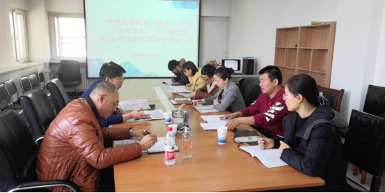 11月14日,我校招生与就业工作处王俊明处长、金乃斯老师,来到外国语学院,指导外国语学院2020届本科毕业生就业工作。外国语学院党委副书记兼副院长周晓丽及全体辅导员接待了王处长一行。