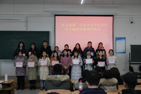 12月23日,为了以赛促学,落实习近平总书记关于学习、关于青年的重要指示精神,培养有理想、有本领、有担当的新时代青年人由教务处、学工处、校团委主办,外国语学院承办的“学习强国”习近平总书记金句外文翻译竞赛颁奖仪式在南区1-544教室举行。外国语学院党委副书记周晓丽出席仪式,并为获奖团队颁奖。