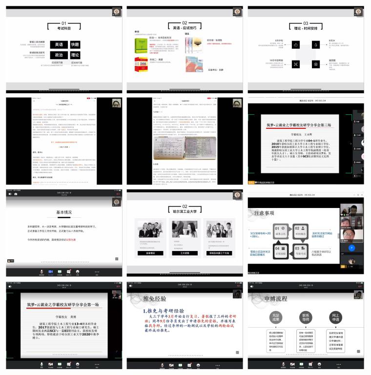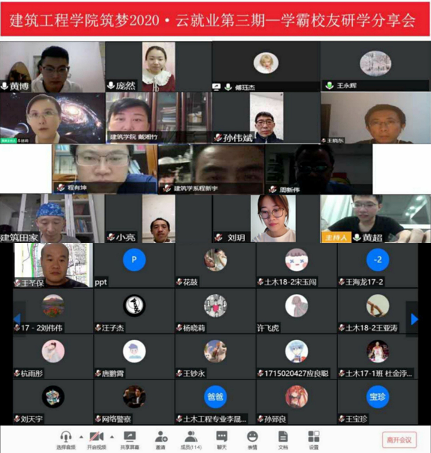 建筑工程学院2020届考研毕业生进入复试的较多,为了增加他们的复试成功率,同时引导2021届学生更好确定考研方向和目标,院长林莉和书记戴湘竹特邀四位学霸校友4月17日下午19:00做客“筑梦2020.云就业”,为建工学子开展研学经验分享。学院领导班子全体成员,各系部负责人,部分专业教师,全体辅导员,2020届准备复试学生、2021届有考研意向毕业生及部分学生家长百余人参加。分享会由2020届毕业班辅导员黄超主持。
