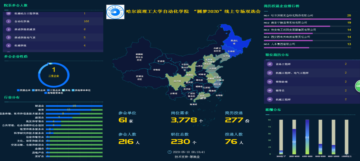 为促进2020届毕业生的精准就业工作,同时也适时启动2021届毕业生就业工作,按照《自动化学院全员就业实施方案》安排,在招生与就业工作处的大力支持下,我院于5月10日成功举办了“圆梦2020”线上专场双选会。本次线上双选会依托于“慧就业”网上平台,在该平台系黑龙江省首次由学院主办的网络双选会,并取得了极高的关注度。