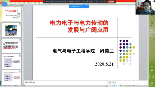 随着新一轮电力改革,电力市场在中国逐渐兴起。电气工程作为现代科技领域中的核心学科之一,也是当今高新技术领域中不可或缺的关键学科。为了帮助19级学生开拓专业视野、完善专业知识体系与专业架构,学院本着“指导学生学习,服务学生发展”的宗旨,帮助学生“知其言明其意”,做好专业认知与深化。于2020年5月21日18:00,召开以“电力电子与电力传动的发展和广阔应用”为主题,的线上直播讲座,讲座由周美兰教授主讲,19级全体电气工程及其自动化专业学生参加。