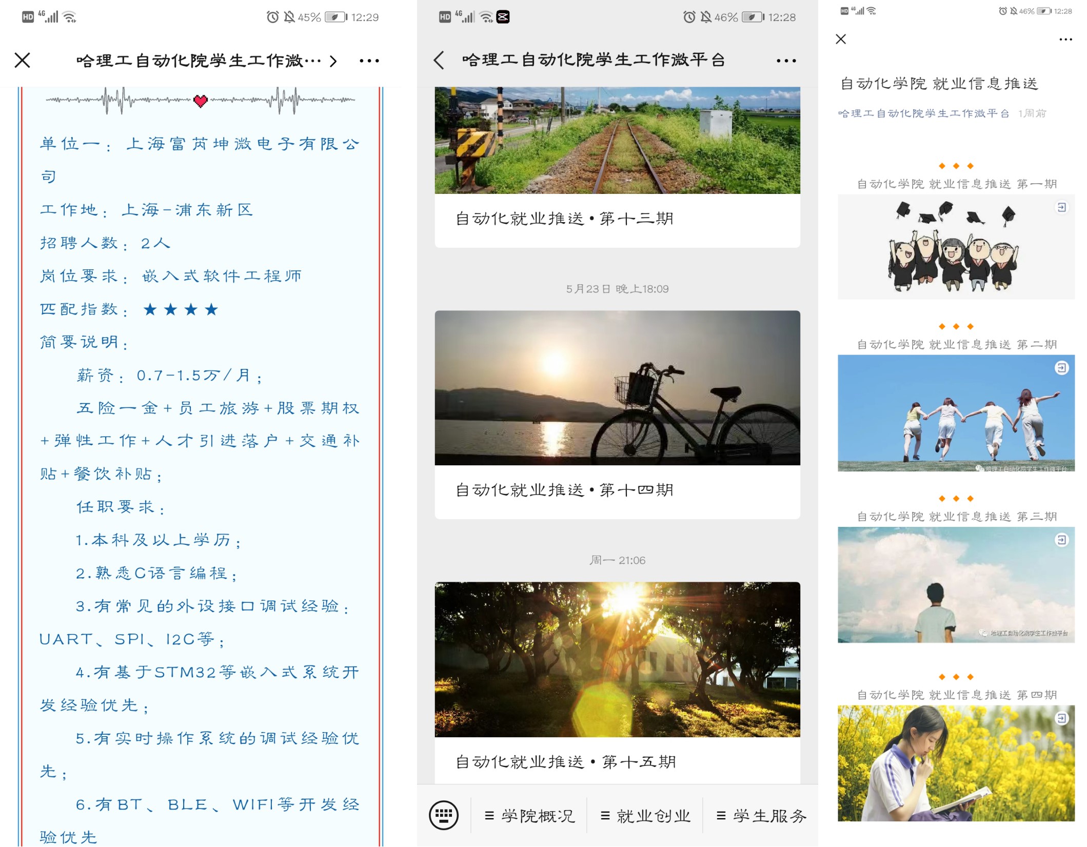 就业信息员团队在学院公众号开辟就业信息专栏,针对自动化和电子信息科学与技术两个专业精准收集、筛选、发布招聘信息,为保证信息的时效性,以两天为单位推送一次。至今已推出就业信息十六期,发布160余家公司500余个工作岗位的需求信息。本系列就业信息均来自于互联网或学院教师推荐,作为学校就业信息网和就业推送群信息的补充,经过工作组的审查、筛选、确认后,发布到就业信息专栏,同时在未就业毕业生和家长微信群中点对点精准推送。