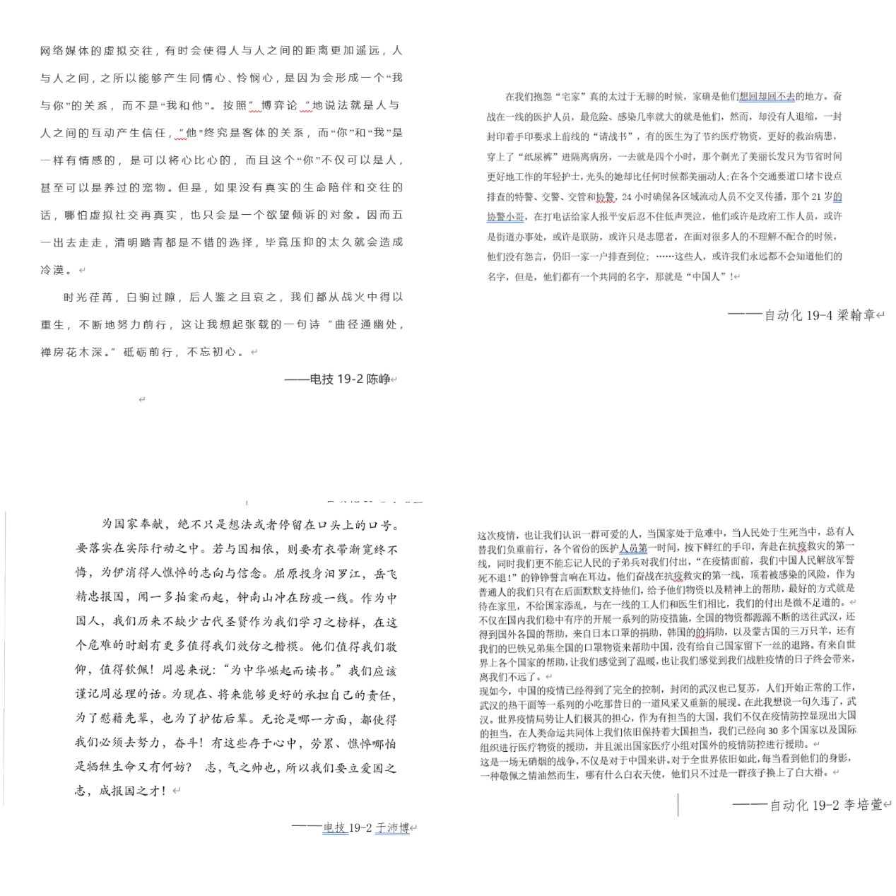 6月1日,自动化学院牛跃老师通过腾讯视频网络会议向各班心理委员布置心理健康征文活动,并对本次活动内容与目的进行讲解。活动开始后,同学们踊跃来稿,积极分享疫情期间的所思所想,或富有哲理,或富有情趣,或蕴含当代青年的责任与担当,以个人的经历、抗疫期间的见闻为创作背景,以不变的温暖希望,责任担当为主旋律,表达出同学们在疫情期间的成长经历和对疫情工作人员的敬佩之情。